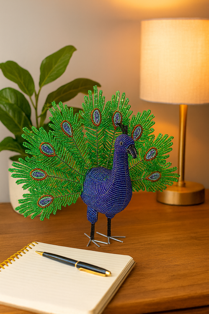 Handmade Beaded Natural Peacock Sculpture – Haitian Artisan Decor.